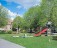 Inngang fra hyggelig bakgårdshave med lekestativ, hagemøbler og sykkelparkering.